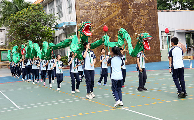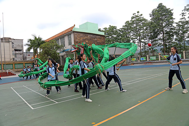 据潘老师介绍,传统芭蕉香火龙是在锣鼓声的指令下做动作的,锣鼓声比较单一,不大适合在体育大课间用,去年学校请专家作了一首壮汉双语原创歌曲作为背景音乐,学生通过歌词记动作,这样舞龙以及各队之间的配合、跑队形更容易整齐了。每次体育大课间,背景音乐响起,24条青龙在彩旗、红绸的映衬下翻飞,场面颇为壮观。 ![]() (体育大课间“舞龙操”套路动作中的“穿龙”)