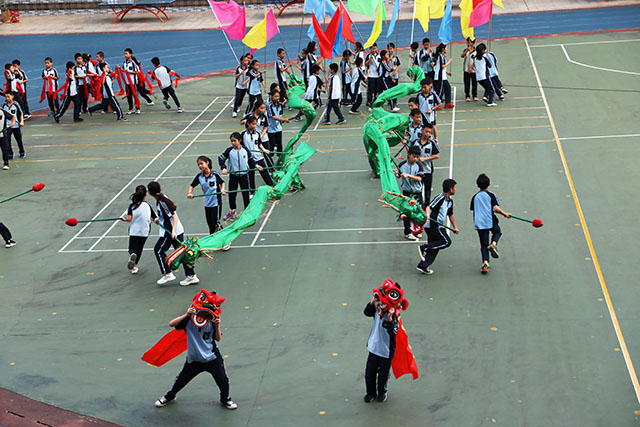 当天的舞龙比赛展示内容为体育大课间的“舞龙操”。“舞龙操”是全员参与,每班两条龙,龙队的同学共16名,还有两名同学舞小狮子,其他的同学则分成两组,手持彩旗和红绸,跑队形。比赛考评每班大课间操的整齐度及龙队的甩龙、盘龙、跳龙、穿龙等套路动作的完成度。