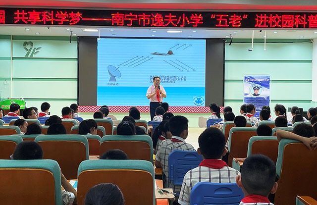 (本网讯)战鹰翱翔,搏击长空,逐梦蓝天。6月22日下午,中国科普作家协会荣誉理事、中国科普作家演讲团执行团长、科普演讲专业委员会主任焦国力来到南宁市逸夫小学,给五年级的学生们带来了一场生动有趣的航空科普讲座。这是由中国科协青少年科技中心,广西壮族自治区科协、自治区教育厅、自治区科技厅、自治区文明办联合主办的“大手拉小手科普报告汇”庆祝建党百年巡讲活动暨2021年广西“大手拉小手,科普报告希望行活动”系列进校园活动之一。