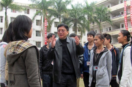 ![]() 北流市教育局局长李如权(中)在白马初中为学生作中考考前心理辅导,与学生畅谈理想。