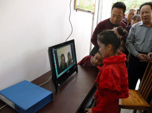 为了让留守儿童享受到家庭的温暖,北流市通过建设“儿童家园”、开设父母热线等方式,加强留守儿童与父母之间的交流。如塘岸镇独竹小学于2012年底开设了“儿童家园”。这个“家”有40平方米,配备了2套电脑,并开通宽带网络,室内还有图书、电视机、影碟机等设备,“儿童家园”不定期组织留守儿童开展活动,他们还能够通过网络视频与在外地打工的父母通话,使家长与子女有一个良好的沟通平台。 ![]() 罗铭瑜在“儿童家园”里通过网络与父母进行视频通话。
