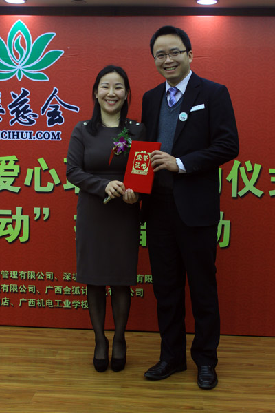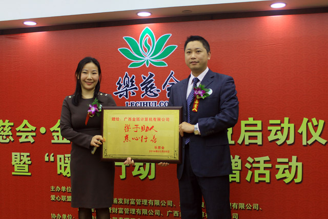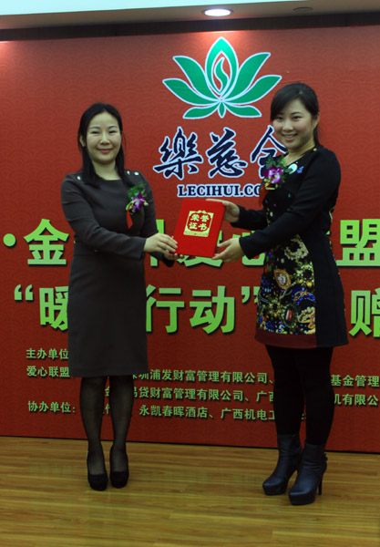 3月9日上午,乐慈会•金融界爱心联盟启动仪式暨“暖春行动”捐赠活动在广西南宁举行,此次“暖春行动”是针对在校贫困生而开启的捐赠项目。本次活动由乐慈会主办,星晨文化传播有限公司、永凯春晖酒店、广西机电工业学校协办。金发所、嘉良基金管理有限公司、浦发财富管理有限公司、华夏资产管理有限公司、金发易贷财富管理有限公司、金狐计算机科技有限公司爱心联盟等爱心金融界企业到现场捐款,很多爱心人士也在现场捐款,当天共计募捐到54万多元的善款,这笔善款将用于资助贫困学生。乐慈会及各企业代表还向在校的贫困大学生们赠送了学习用品,希望他们能专心刻苦的学习,将来学有所成,承继爱心,帮助更多需要帮助的贫困人群。乐慈会中国区总干事岑小兰在现场代表乐慈会接收了捐款,岑女士感谢所有参与爱心慈善捐助的企业及个人,并希望通过此次活动有更多人能感知乐慈会的号召,共同关注和参与到慈善事业当中,去帮助和关爱需要帮助的弱势群体。