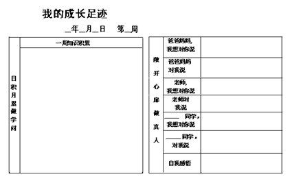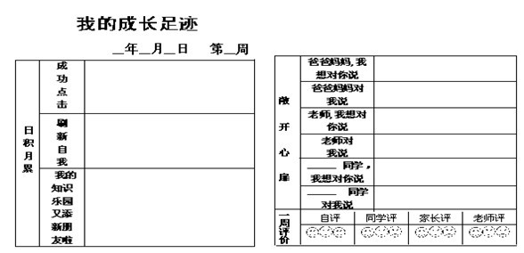 我们课题组从引导学生写一周总结开始,创编了供一至六年级学生使用的《我的成长足迹》小册子,指导学生每周回顾总结并填写一周以来的在校情况,包括有哪些进步、哪些方面没有做好等内容;同时让学生学会对父母家人、老师同学“敞开心扉”,畅谈自己在学习、生活中的喜怒哀乐、成功、困惑等,使教师、家长了解自己,并得到教师、家长有针对性的鼓励和建议。这种无声的交流,有效地整合了学生身边的教育资源,调动了家长、老师和学生同伴的力量,增进了学生与老师、家长和同伴之间的相互了解,使教育达到遇物而诲,遇事而教的境界,同时还促进了学校温馨和谐、团结友爱氛围的形成。