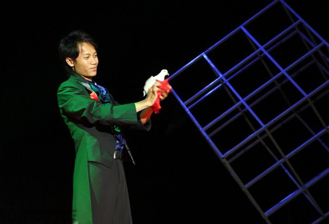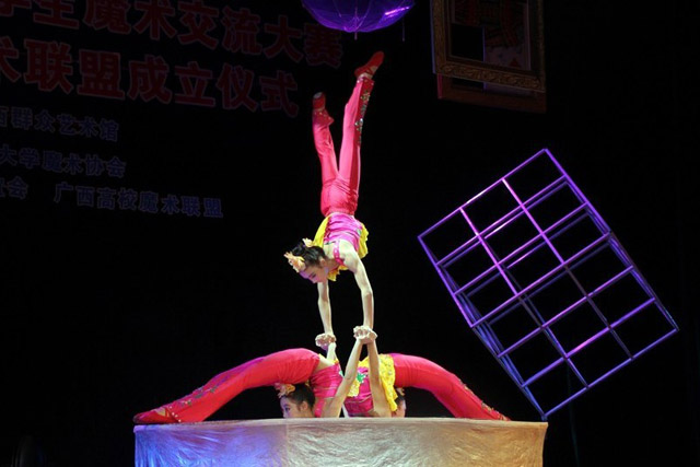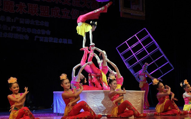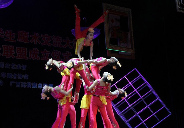 11月2日晚,广西首届大学生魔术交流大赛在广西大学大礼堂举行一场盛大的魔术大赛决赛。来自广西大学、广西艺术学院、桂林理工大学等高校的的魔术爱好者参与本次魔术大赛,广西艺术学院的杨宇阳和康桐伟获得大赛一等奖。 大赛一开场,精彩的戏剧变脸和高难度的花样自行车表演就赢得现场观众的阵阵掌声,现场气氛一下子活跃起来,女主持大变活人的出场更一下子吸引了众人的眼球。魔术大赛就在这样热烈的气氛中开始。 本场大赛也是此次魔术大赛的决赛。大礼堂坐满了观看的同学。共有五位选手晋级到本次决赛。一号选手黄家嘉俊为大家表演了近景魔术《魔术》,道具是简单的一长一短的两根绳子。两根绳子在他灵巧的手下一会儿变得等长,一会儿拧成一根绳子,简单明快的魔术手法很快吸引了大伙。 二号选手杨宇阳的《伞阳开泰》更是把魔术变得繁复华丽,他的手中不断变换出各式的伞,引得现场观众忍不住感叹“他全身都是伞啊!”之后表演悬浮的棒更让现场观众忍不住大声尖叫,为魔术的神奇而激动。 五位选手各自展现自身的绝活。三号选手康桐伟的魔术《童年》变出了童年时的故事。他一边深情讲述自己的童年故事把观众引入童年怀想中,最后变出了会走的橡皮人让现场观众啧啧称奇。广西大学刘从容的魔术《小鱼》从纸上大变活鱼,让来自日本的评委小林浩平忍不住给他打了96分的高分。而现场的比赛最高分只有94分。 本场魔术大赛最终由来自广西艺术学院的杨宇阳和康桐伟获得大赛一等奖。 广西大学魔术协会的副会长许明炜介绍:“对于全国而言,广西没有一个如此专业的平台让魔术师能够聚集起来。举办此次大赛的目的就是让广西所有高校的魔术爱好者能够参与其中,展现自己最精彩的一面。” 据了解,本次魔术大赛由广西壮族自治区群众艺术馆主办,广西大学魔术协会协办,旨在鼓励魔术界的发展,发展我区高校的文化事业,也为魔术爱好者创造更多的表现平台。( 何美凡)