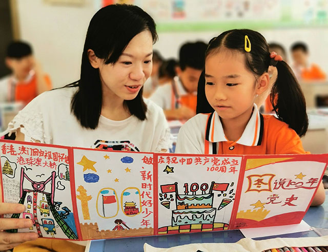 在活动前期的相关美术指导课上,美术教师从构图到线条的勾画、从布局再到涂色,都进行了悉心地指导,并鼓励同学释放想象力大胆创作:画画可以没有固定的标准,但一定要发挥自己的想象力。 参展的作品陆续送到评委老师处,评委老师仔细比较、评审,从中选出优秀作品展出。展位上一幅幅惟妙惟肖的画面映入眼帘,同学们用五颜六色的画笔描绘出对党和祖国最真挚的情感和最美好的祝福,一幅幅作品连接成一幅美丽画卷:那一个个乘坐着红船的民族少年,正迎风远航;“奋勇担当、笃定前行”代表了小小少年永远跟党走的决心;党旗招展、礼花冲天,锣鼓喧天,普天同庆…… 书法作品也各具特色,隶书、楷书……笔触行云流水,或清秀雅致,或笔走龙蛇,充分展示了同学们对书法的热爱和扎实的基本功。 此次书画展,同学们用心传承红色基因,用书画庆祝建党100周年,充分发挥了书画艺术特有的翰墨育人作用,提升了翡翠学子的艺术人文素养,在传承、弘扬中国优秀传统文化的同时,增强了文化自信心和民族自豪感。(南宁市翡翠园学校 陆丽祥 欧奔) ![]() |