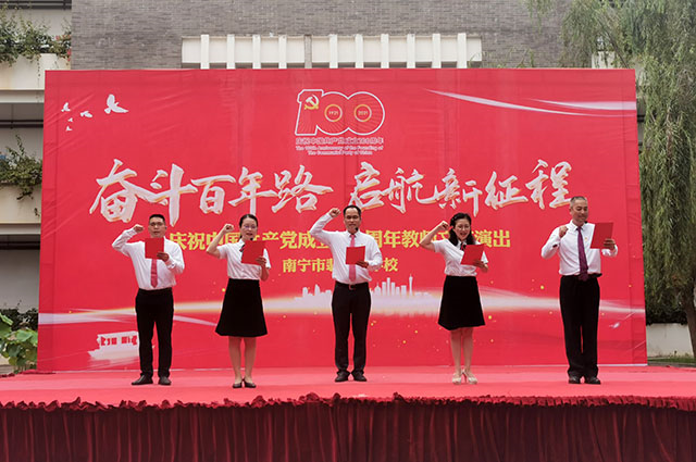 (本网讯)回眸百年荣光,唱响心中赞歌。7月1日,在举国同庆中国共产党成立100周年之际,南宁市翡翠园学校隆重举行“奋斗百年路,启航新征程”主题文艺演出,全体党员教职工齐聚一堂同唱赞歌,共同铭记百年风雨兼程的历史,感恩党带领民族走向伟大复兴,倾诉爱党深情。