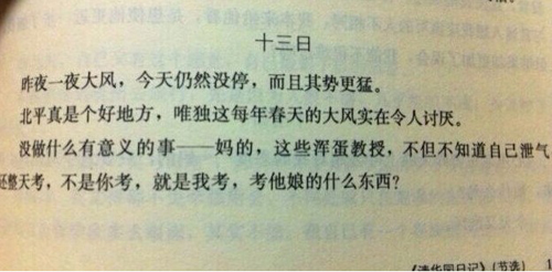 “不是你考,就是我考,考他娘的什么东西?”近日,已故国学大师季羡林1934年在清华大学读书时所写的一段日记被网友晒到网上,引发热议。原来国学大师也会抱怨“整天考试”,网友纷纷称赞大师“真性情”。 本段文字出自季羡林的《清华园日记》,据悉,该日记出版时编辑曾提出“做适当删减”,季羡林则坚持一字不改。“我考虑了一下,决定不删,一仍其旧,一句话也没有删。我七十年前不是圣人,今天不是圣人,将来也不会成为圣人。” 《清华园日记》一书目前有江苏文艺出版社、外语教学与研究出版社、辽宁美术出版社等多个版本,本书是季羡林先生在清华大学读书时的日记,是70年前季先生对清华园的真切描述,也是他最具体的生命的痕迹的记录。据悉,季羡林从17岁写散文起,几十年笔耕不辍,已有80余万字之多,其散文随笔作品有《清塘荷韵》、《清华园日记》、《牛棚杂忆》、《天竺心影》等,现代散文作家钟敬文在庆贺季羡林88岁米寿时曾说:“文学的最高境界是朴素,季先生的作品就达到了这个境界。他朴素,是因为他真诚。”(陈苑) |